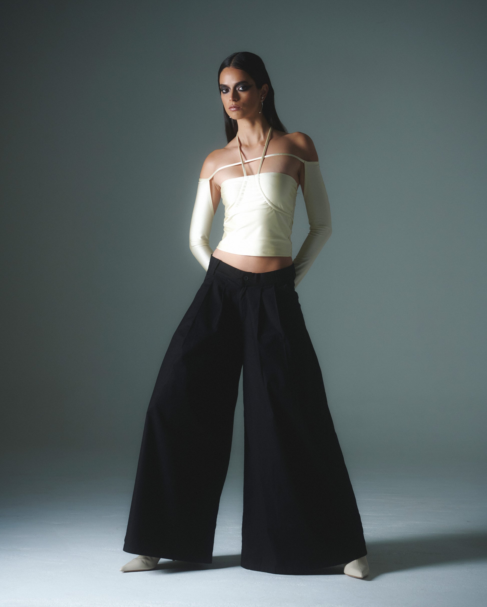 Pantalón de tiro medio con calce amplio y estructura marcada. Confeccionado en un tejido de cuerpo, presenta doble pinza en cada lado que genera volumen y caída amplia desde la cintura. Cuenta con bolsillos delanteros, cierre frontal con cremallera y botón. Una silueta que redefine el clásico pantalón sastre.