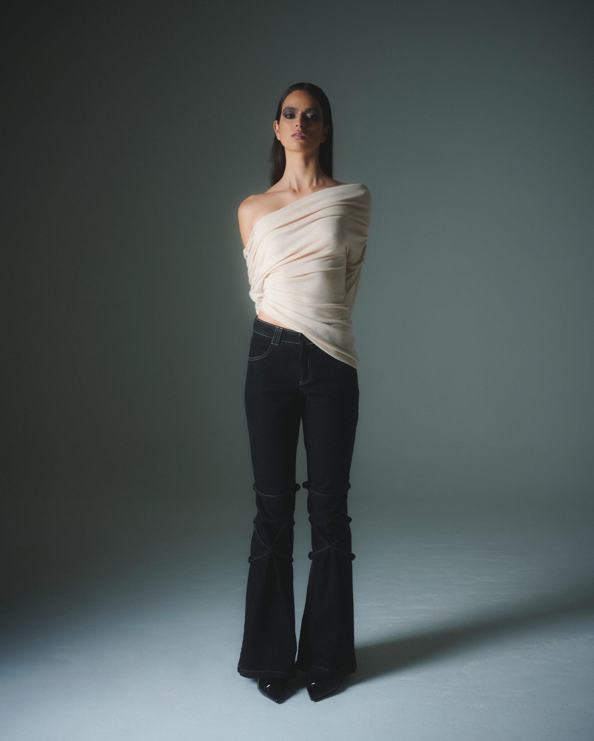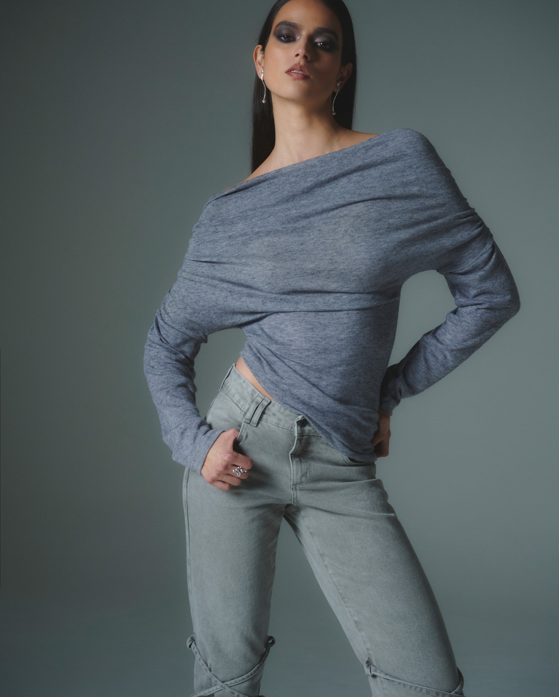Top confeccionado en tela suave, con diseño off-shoulder y drapeados laterales. Su diseño versátil permite usarlo con uno o ambos hombros descubiertos. Mangas largas y bajo irregular que acentúan el diseño asimétrico de la prenda.