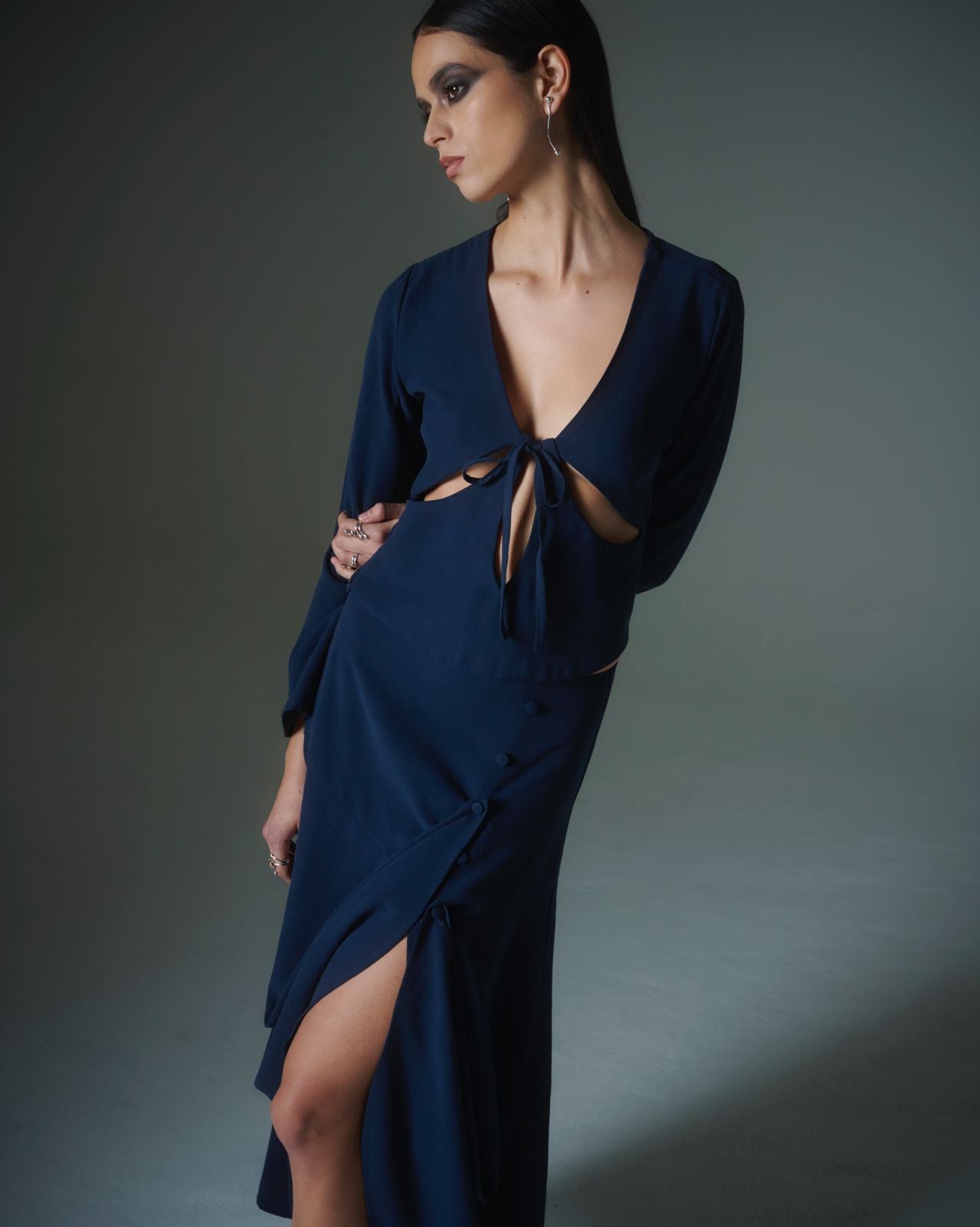 Top de manga larga confeccionado en una tela liviana con caída. Presenta escote profundo con cortes cut-out en el frente y amarra central que define la silueta