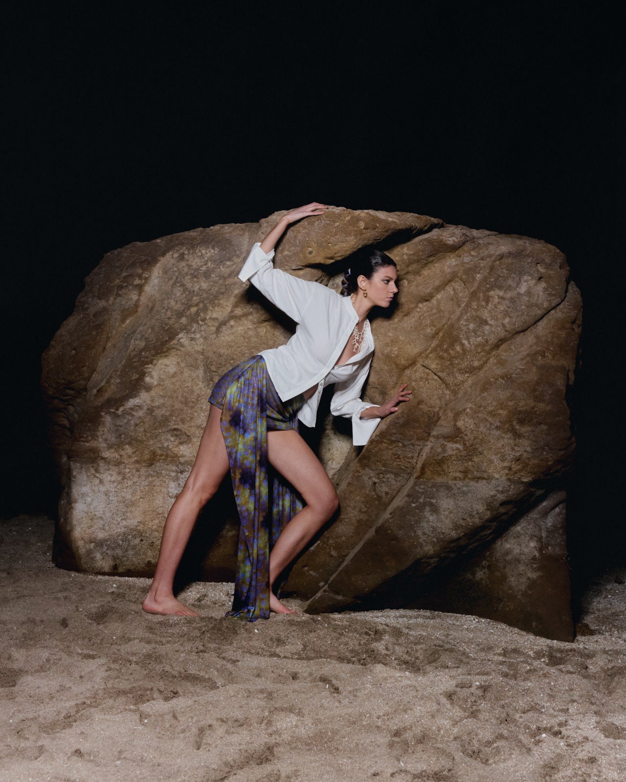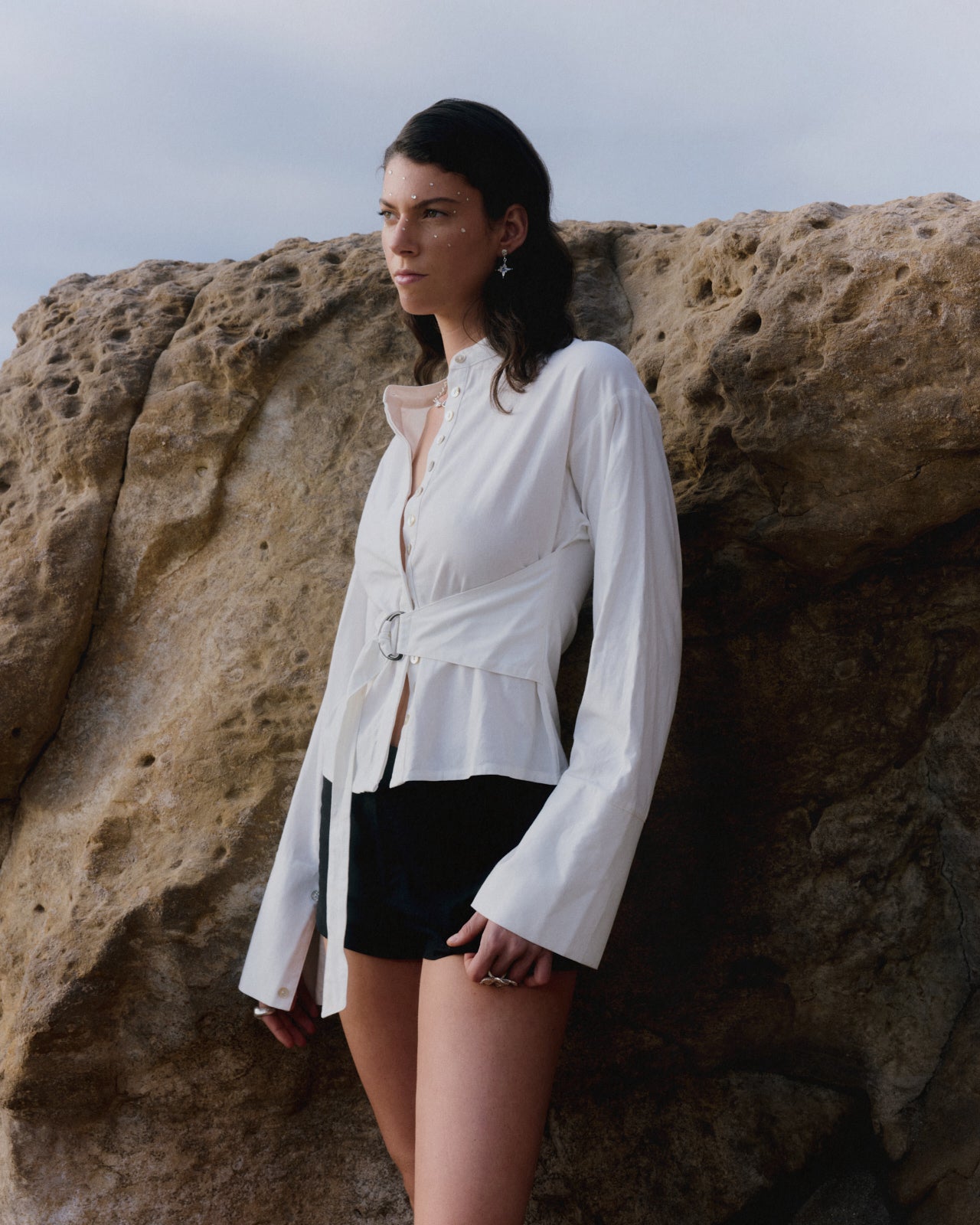 Camisa confeccionada en lino con viscosa, manga larga con puños oversized y cierre frontal con botones. Ajustable en la cintura mediante un cinturón incorporado, que puede usarse hacia adelante o hacia atrás para variar la silueta.